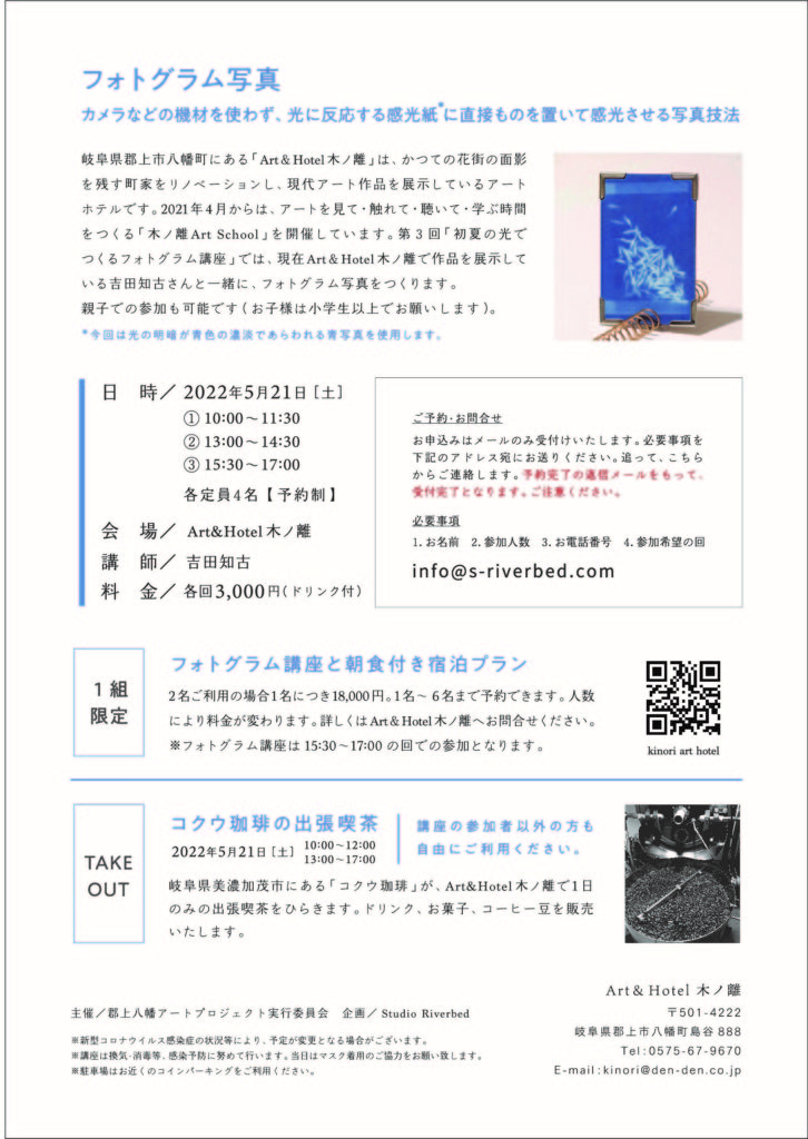 岐阜県郡上市八幡町にあるArt&Hotel木ノ離は、かつての花街の面影を残す町家をリノベーションし、現代アート作品を展示しているアートホテルです。2021年4月からはアートを見て・触れて・聴いて・学ぶ時間をつくる「木ノ離Art School」を開催しています。第3回「初夏の光でつくるフォトグラム講座」では、現在Art&Hotel木ノ離で作品を展示している吉田知古さんと一緒に、フォトグラム写真をつくります。親子での参加も可能です。(お子様は小学生以上でお願いします)